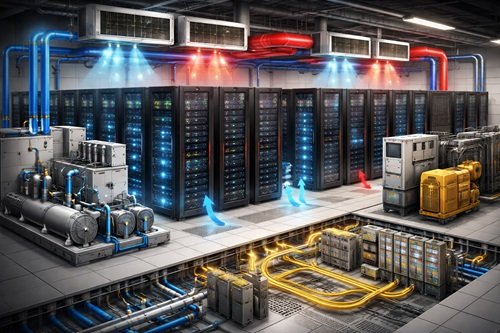 Cooling & Power Distribution ensures stable electricity and proper temperature control for data center equipment, protecting hardware and maintaining reliable system performance.